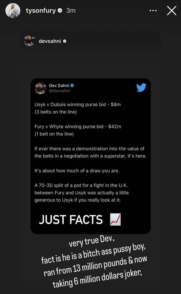 Tyson Fury hat Alexander Usik nicht vergessen und sich dazu entschlossen, das Werbeangebot für das Duell des Ukrainers gegen Daniel Duboiswonvon K2 mit einem Einsatz von 8 Millionen Dollar zu kommentieren. Der WBC-Champion reagierte auf Instagram auf den Post des Journalisten Dev Sahni, der wie folgt lautete:
