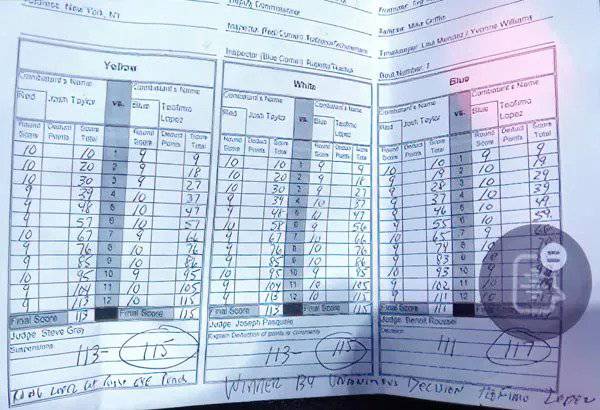 Nach einem Zehn-Runden-Kampf zwischen dem WBO-Weltmeister im Weltergewicht Josh Taylor und Teofimo Lopez werteten die Punktrichter Steve Gray und Joseph Pasquale den Kampf mit 95-95. Kampfrichter Benoit Roussel gab Lopez mit 97-93 auf der dritten Karte den Vorzug. Lopez hatte ein starkes Finish und gewann die letzten beiden Runden auf allen drei Zetteln mit 115-113, 115-113 und 117-111 am Ende. Hätte es Taylor jedoch geschafft, entweder in der elften oder zwölften Runde zu gewinnen, hätte er den Titel mit einem Unentschieden behalten.