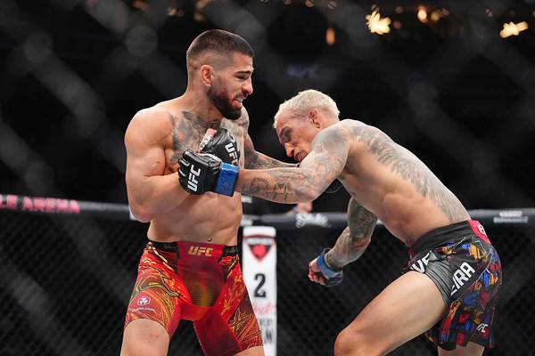 Topuria besiegte Charles Oliveira in der ersten Runde und wurde damit neuer Champion der Leichtgewichtsklasse im Hauptkampf von UFC 317 in Las Vegas, USA, gestern, 29. Juni.