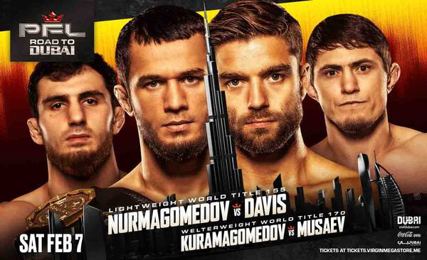 Präsentation der Ergebnisse der PFL-Kampfnacht in Dubai, die am 7. Februar stattfand. Die Show wurde von einem Leichtgewichts-Titelkampf zwischen Usman Nurmagomedov und Alfie Davis angeführt.