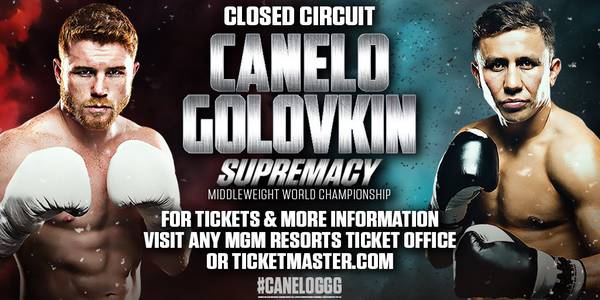 Tickets for the closed circuit telecast of Canelo vs. Golovkin at Bellagio Resort and Casino, MGM Grand Hotel and Casino, Mandalay Bay Resort and Casino, The Mirage Hotel and Casino, Monte Carlo Resort and Casino, New York-New York Hotel and Casino, Luxor Hotel and Casino, and Circus Circus Las Vegas are priced at $75, not including applicable fees.Â