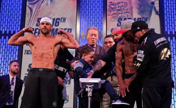 Controversy reared its head at the weigh-in for Billy Joe Saunders' world title defence against Willie Monroe Jr when the champion's son aimed blows at the challenger.