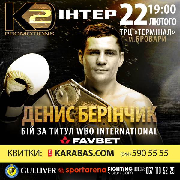2012 Olympic silver medalist and the owner of the title of WBO International lightweight champion Denys Berinchyk (12-0, 7 KOs) will have his next pro fight on February 22 at the SEC "Terminal" in Brovary, Ukraine in the main event of the boxing evening of K2 Promotions Ukraine.
