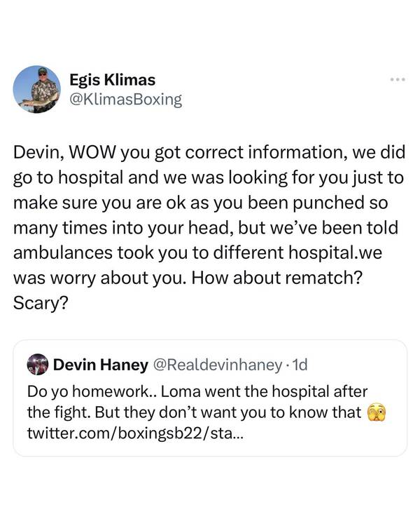 “Devin, wow, you have the right information. We really went to the hospital and worried about you because you missed too many blows to the head. We were told that the ambulance took you to another hospital, we were worried about you. How about a rematch? Are you afraid? — wrote Klimas.