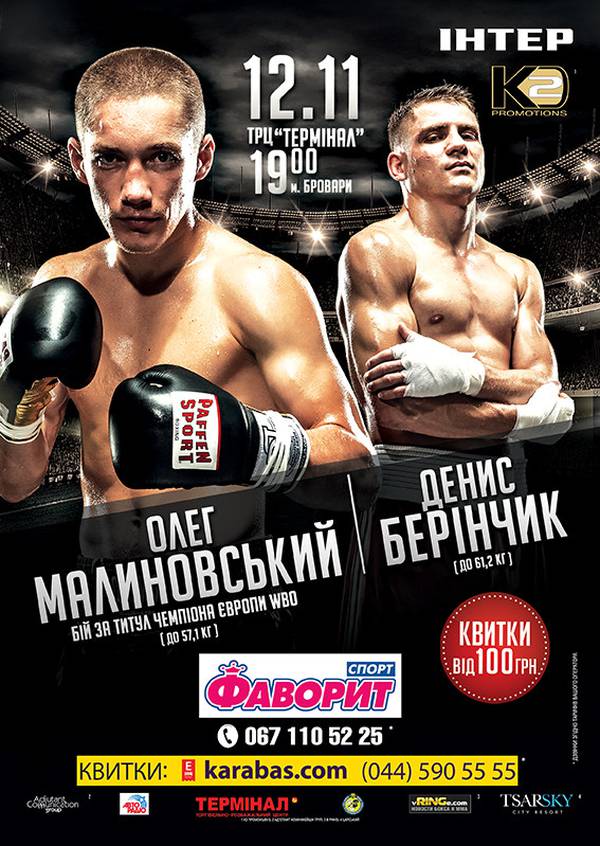 Напомним, что 12 ноября в ТРЦ «Терминал» (Бровары) чемпион Европы по версии WBO в полулегком весе украинец Олег Малиновский (18-0, 5 КО) проведет первую защиту титула в поединке с многоопытным уроженцем Никарагуа с испанским паспортом Эусебио Осехо (28-18-3, 8 КО) по прозвищу «Гремучая змея». В этот же вечер многообещающий легковес Денис Беринчик (4-0, 3 КО), принесший Украине «серебро» Чемпионата мира-2011 и Олимпиады-2012, встретится в рейтинговом 8-раундовом бою с испанцем мексиканского происхождения Хуаном Окурой (11-7-1, 4 КО). В андеркарде в ринг выйдет ряд подающих надежды боксеров, включая представителя «К2 Promotions Ukrainе» Мишико Беселию, боксеров «Sparta Bpxong Promotions» Арама Фанияна и Андрея Великовского, зрелищного суперсредневеса Марата Кулумбегова и других.
