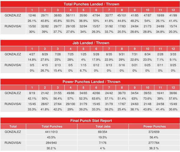 Согласно компьютерной статистике CompuBox, Роман Гонсалес донес до цели больше ударов в 10 из 12 раундов и поставил рекорд второго наилегчайшего веса, попав силовыми ударами 372 раза по Срисакету Сор Рунгвисаю, которому судьи насчитали победу большинством голосов, отдали пояс WBC, вписали «Чоколатито» первое поражение в карьере и лишили его, таким образом, претензий на лидерство в Р4Р.