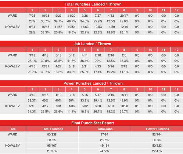 Согласно компьютерной статистике ударов CompuBox, за неполные 8 раундов Андре Уорд в поединке 17 июня в Лас-Вегасе против Сергея Ковалева смог донести до цели всего 80 ударов из 238 выброшенных (34%), тогда как Ковалев — 95 ударов из 407 выброшенных (23%).