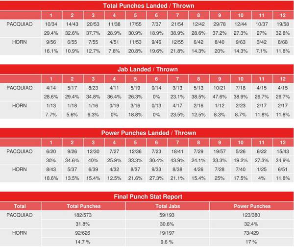 Согласно компьютерной статистике CompuBox, Мэнни Пакьяо выиграл в бою против Джеффа Хорна по количеству нанесенных ударов 182-92, и смог донести до цели 32% из всех выброшенных ударов. В силовых ударах преимущество также оказалось за Пакьяо 123-73, большую часть из которых он нанес в разгромном 9-м раунде. Лишь в одном из раундов, девятом, Хорн смог нанести больше ударов, чем Пакьяо, но все равно всего 15% его попаданий оказались точными. Явный претендент на самое несправедливое судейское решение года.
