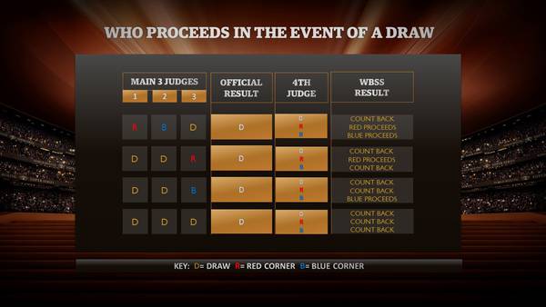 Если, несмотря на карточки четвертого судьи, поединок все равно оценен как ничейный, будет применен метод так называемого обратного отсчета (Count Back). В нем будут оцениваться карточки трех официальных судей. Для начала, будут приниматься во внимание очки за 12-й или последний раунд. Боксер, который по оценкам судей был лучше в этом раунде, то есть как минимум на двух карточках, будет считаться победителем.