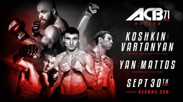30 сентября в московском дворце спорта «Динамо» пройдет вечер смешанных единоборств ACB 71, в рамках которого состоится сразу два титульных боя. Во втором по значимости поединке турнира за временный титул в легкой весовой категории сразятся Эдуард Вартанян и Андрей Кошкин. А закрывать программу бойцовского шоу будет поединок, в котором проведет первую защиту чемпионского пояса в легчайшем весе Петр Ян, противостоять ему будет представитель бразильской школы ММА — Матеус Маттос.