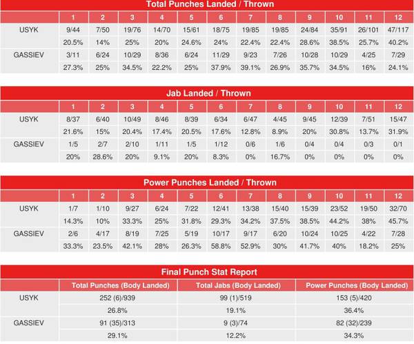 Согласно статистике CompuBox, в поединке против Мурата Гассиева (26-1, 19 КО) Александр Усик (15-0, 11 КО) с каждым раундом лишь наращивал обороты. В среднем за 12 раундов он донес до цели 21 удар из 78 выброшенных, в то время как Гассиев — 8 из 26. За последние шесть раундов боя Усик лишь увеличил свою активность, когда доносил до цели 29 из 94 выброшенных ударов. В последнем раунде Усик нанес 47 из 117 выброшенных ударов.