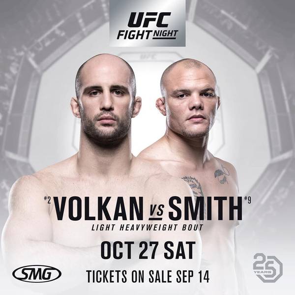Бой в полутяжелой весовой категории UFC между Волканом Оздемиром и Энтони Смитом возглавит турнир UFC Fight Night 138, который пройдет 27 октября в Монктоне, Канада.