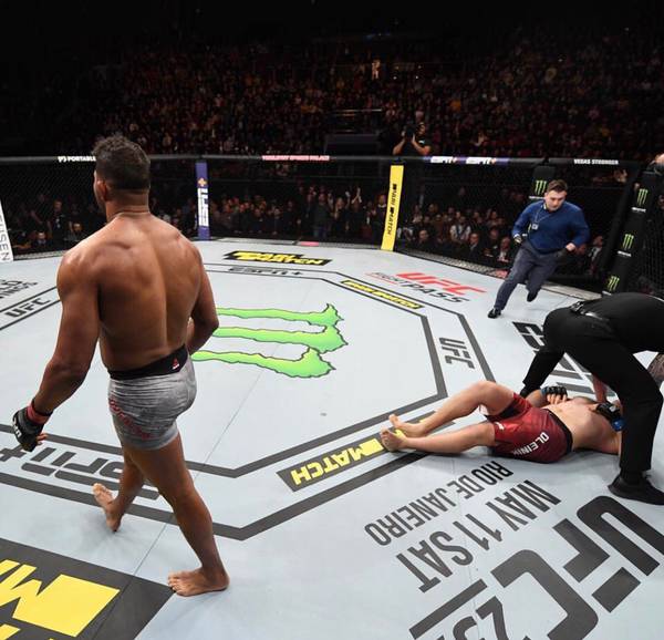 Бойцы часто сходились в клинче, и в одном из таких моментов Оверим нанес четыре мощнейших удара коленом в голову, сразил оппонента на настил и мастерски провел добивание.