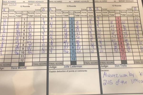 На момент остановки боя в 11-м раунде Сауль Альварес лидировал на записках судей Дейва Моретти и Джули Ледерман (96-94). На записках третьего бокового Дона Треллы была ничья 95-95. Таким образом, даже если бы Канело не удалось нокаутировать россиянина, а хотя бы продолжать боксировать в таком же духе, судьи в Лас-Вегасе насчитали бы ему победу единогласным решением.