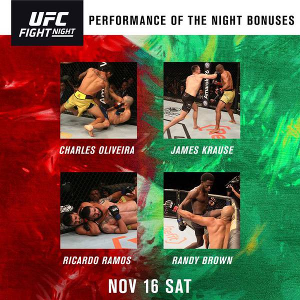 Ни один из поединков, которые прошли на UFC Fight Night 164, не был признан «Боем вечера». А вот бонусы за «Выступление вечера» получили сразу четыре человека: Чарльз Оливейра, Джеймс Крауз, Рикардо Рамос и Рэнди Браун. Каждый из бойцов получил по 50 000 долларов.