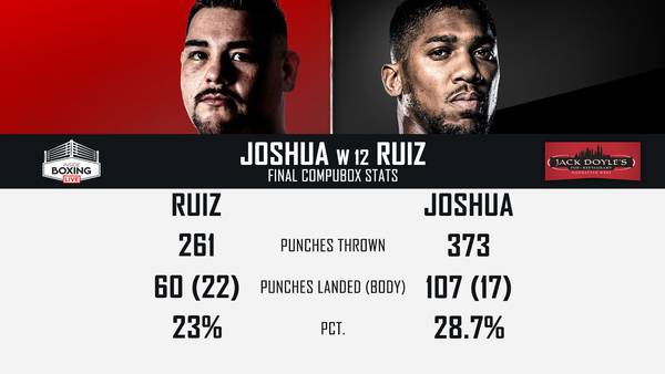 Согласно статистике ударов CompuBox, за двенадцать раундов реванша Энтони Джошуа нанес 107 ударов (17 по корпусу) из 373 выброшенных (28,7%), в то время как Энди Руис — 60 ударов (22 по корпусу) из 261 выброшенного (23%). 65 из 107 нанесенных ударов Джошуа были джэбами. 93% всего времени боя противники провели на дистанции.
