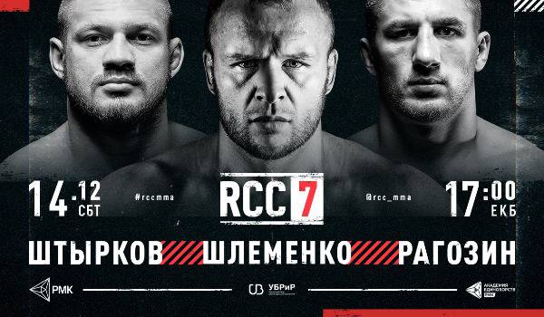 Сегодня в Екатеринбурге пройдет 7-й турнир промоушена RCC. Любителей ММА ожидают 13 интересных поединков. В карде значатся такие имена, как Александр Шлеменко, Иван Штырков и другие. Трансляция начнется в 15:00 по МСК. Ниже приведена ссылка на трансляцию и файт-карта события: