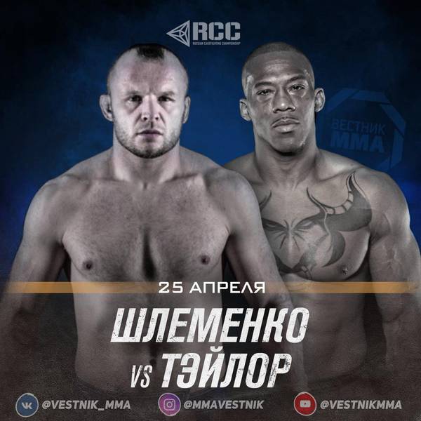25 апреля в Екатеринбурге пройдет турнир российского промоушена RCC. На этом ивенте выступит Александр Шлеменко. Его соперником станет бывший чемпион организации PFL Луис Тейлор.