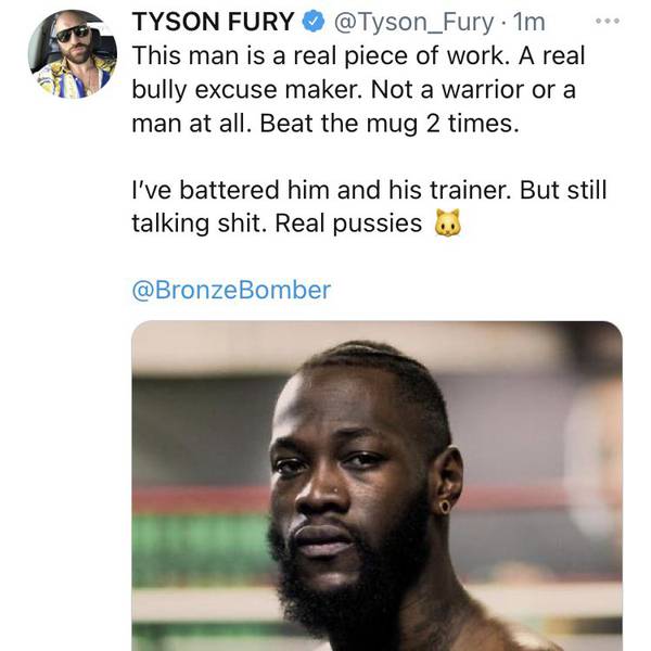 Тайсон Фьюри (30-0-1, 21 КО) вернулся к тренировкам после длительного перерыва, но также вернулся в социальные сети. Вчера он разместил в Instagram видео из своего тренировочного лагеря, а сегодня напал на Деонтея Уайлдера в Twitter.