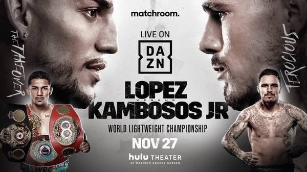 Прямая трансляция вечера бокса, который пройдет 27 ноября в Лас-Вегасе на арене MGM Гранд, и в главном событии которого состоится поединок Теофимо Лопес (16-0, 12 KO) — Джордж Камбосос-младший (19-0, 10 KO) за титулы WBC «франшиза», IBF, WBO и WBA в весовой категории до 61,2 кг.