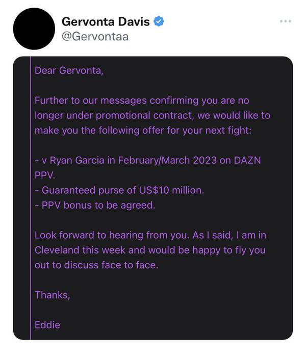Джервонта Дэвис (27-0, 25 КО) рассказал о предложении, которое он получил некоторое время назад от Эдди Хирна. За бой с Райаном Гарсией (23-0, 19 КО) он должен был получить 10 миллионов долларов плюс часть от продаж PPV. Поединок мог состояться в феврале или марте на DAZN. Но, как известно, это предложение не прельстило американца, который, по его словам, уже зарабатывает намного больше.