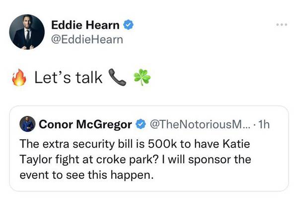 «Организаторам не хватает 500 тысяч, чтобы устроить поединок Кэти Тайлор на Кроук Парке? Я проспонсирую это событие, чтобы посмотреть, что будет», — написал Конор в своем твиттере. «Давай это обсудим», — тут же отреагировал на сообщение промоутер потенциального поединка Эдди Хирн.